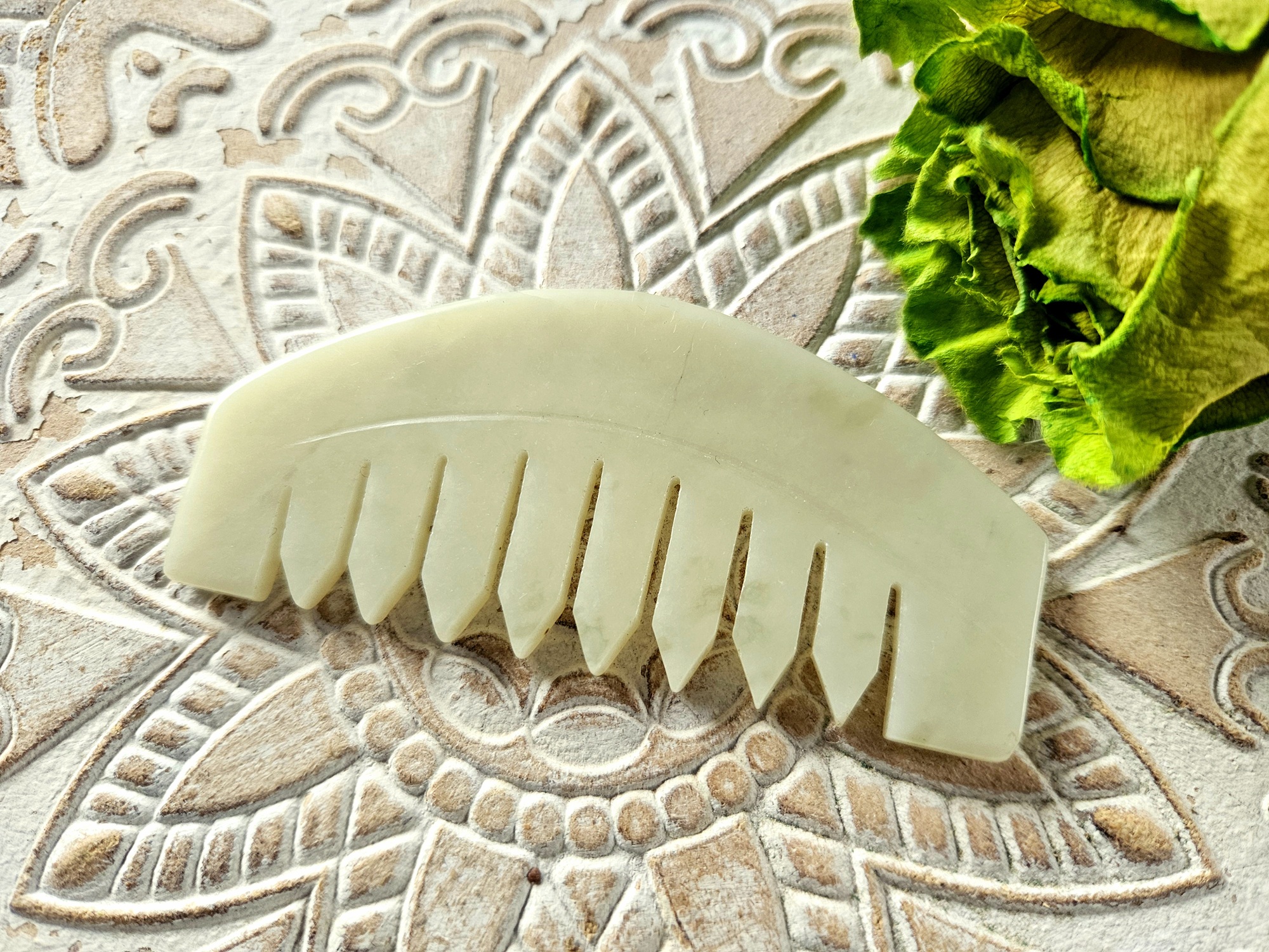 MATERJAL: kamm on naturaalse poleeritud jaadi kristallist; mõõdud 8,5 x 4 x 0,5 cm