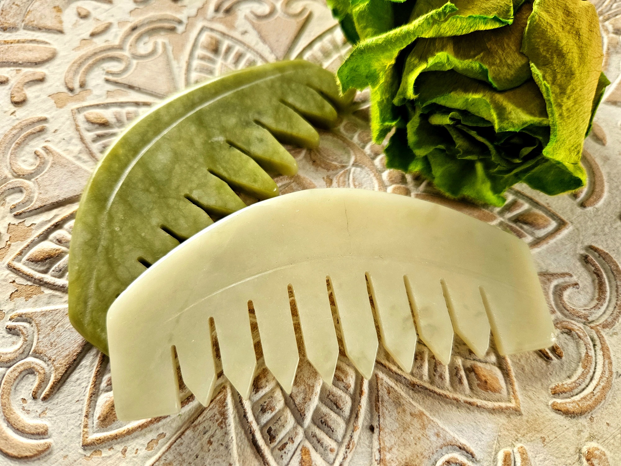Rohelise jaadi kristallist minimalistlik kamm on mõeldud nii juuste kammimiseks kui peanaha masseerimiseks, lõdvestamiseks, värskendamiseks ja trimmimiseks, sobib ka kogu kehale massaaži abivahendina.