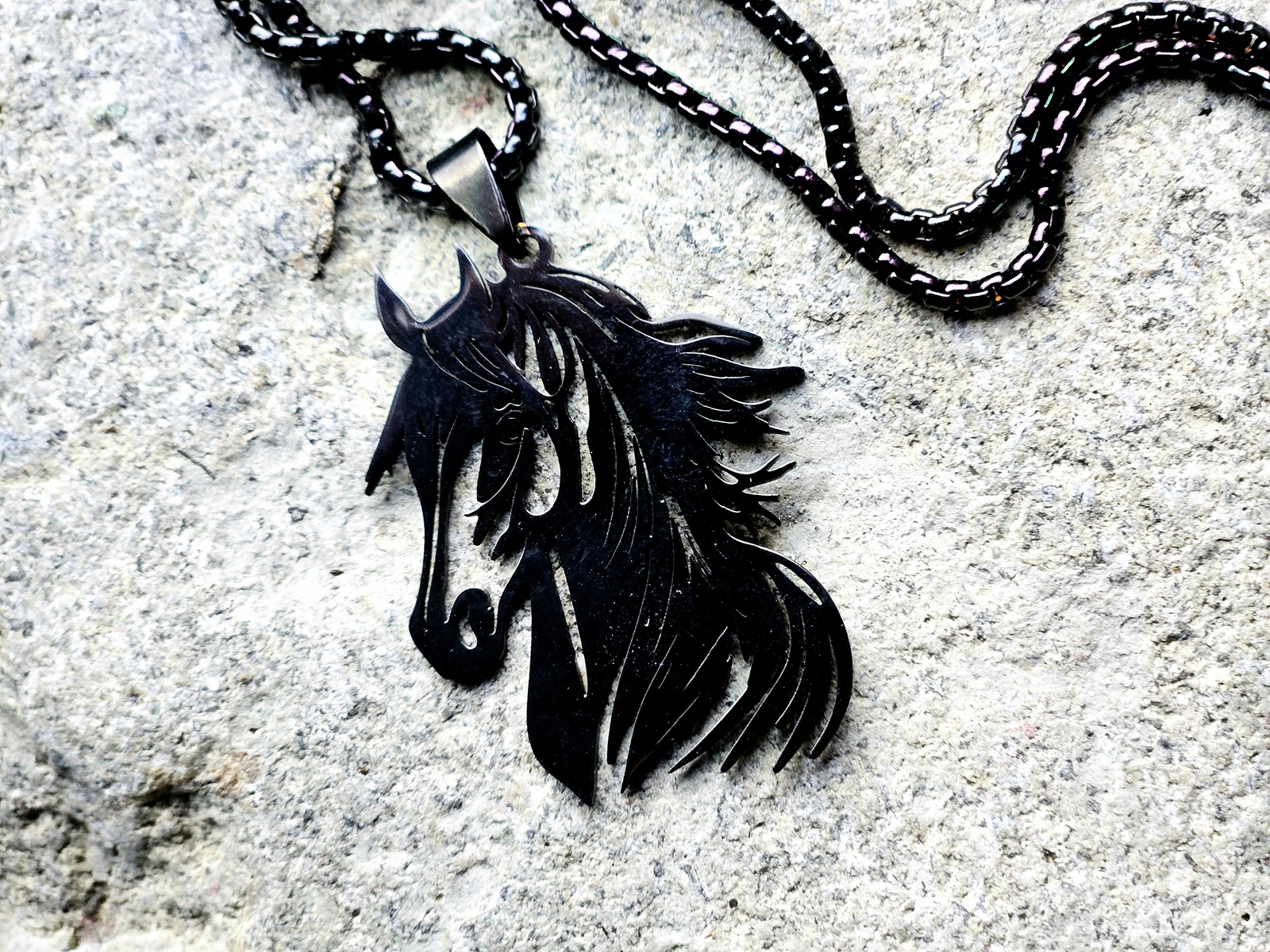 TOOTEINFO: materjal: mustaks värvitud roostevaba metall (allergiavaba); kaelaehte mõõdud: keti pikkus 60 cm, hobusepea ripats 4 x 3 cm