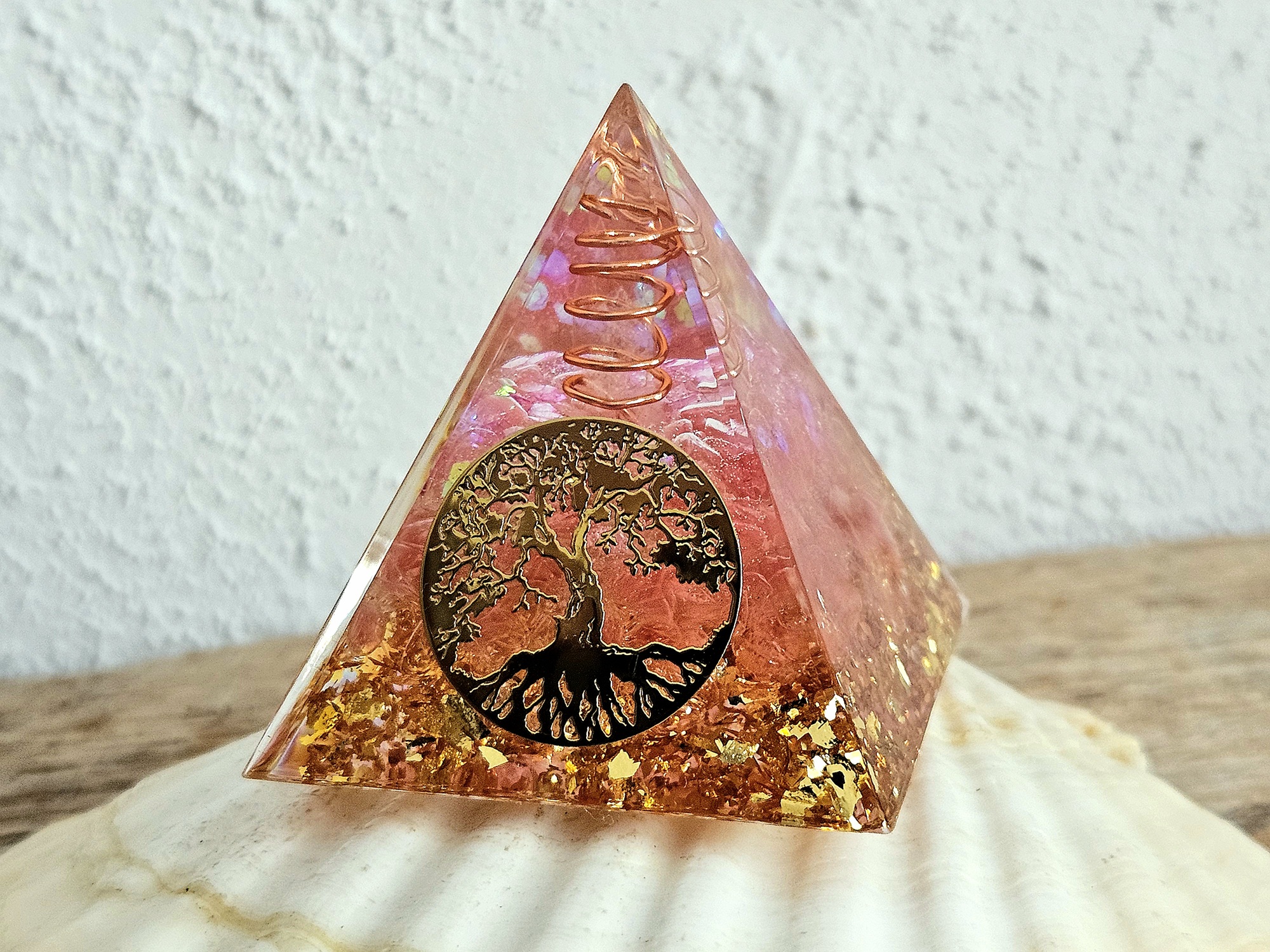 Materjal: püramiid on käsitööna valmistatud roosa kvartsi killukestest, kuldsetest helvestest , vasest ja vaigust, ühel küljel elupuu sümbol