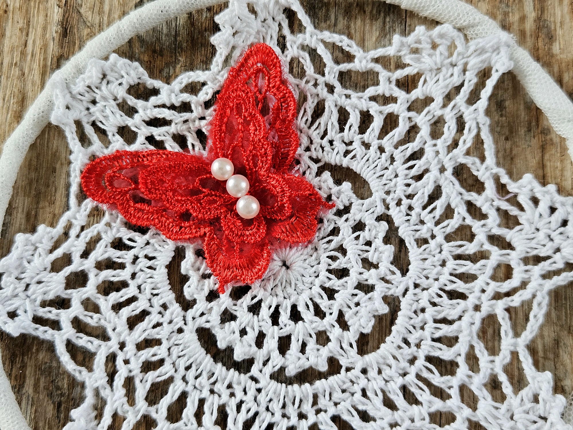 Rõnga küljest ripuvad alla mitmes eri pikkuses punased ja valged suled. Suled on kinnitatud eri värvi topelt-helmestega. Rõnga sees on heegeldatud võrk, millel punane aplikatsioon- tehnikas liblikas. Kaunistuseks punased lehvi seotud paelad.